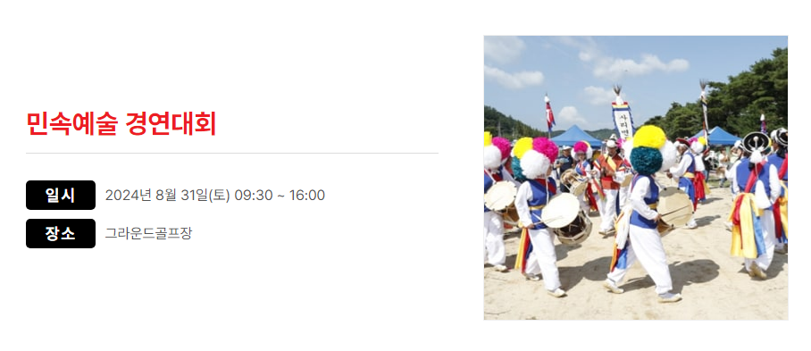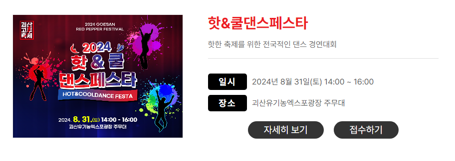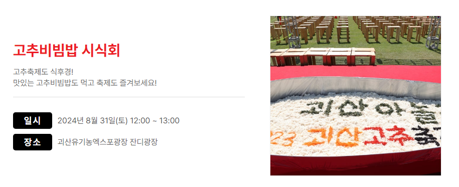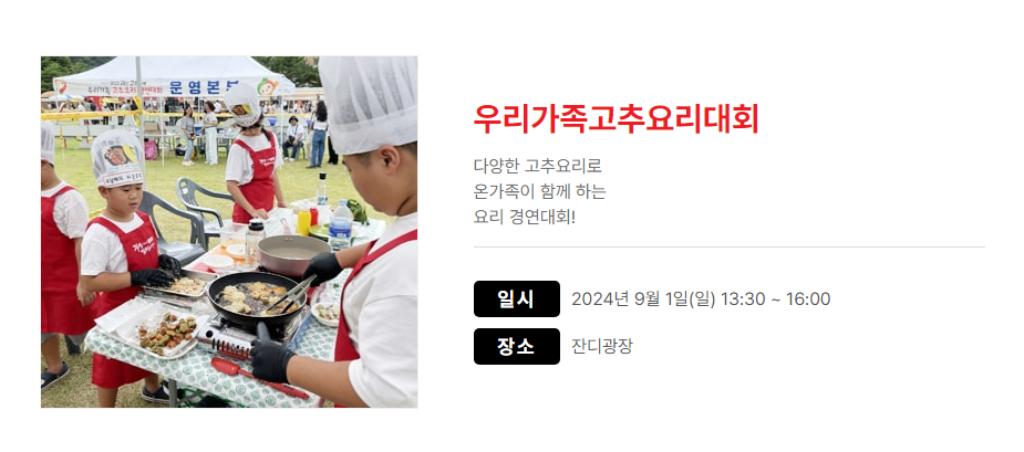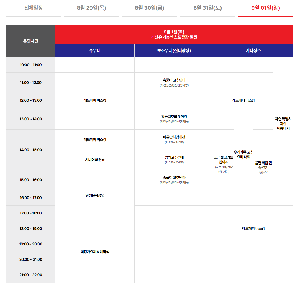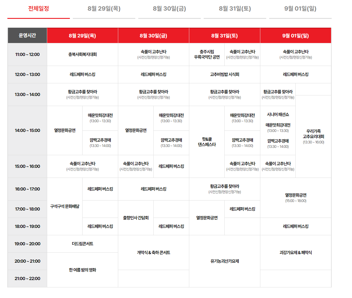 8월 31일 댄스경연대회로 핫한 축제 분위기를 느끼실 수 있으며, 맛있는 고추비빔밥 시식회, 씨름대회 및 민속예술 경연대회도 열릴 예정입니다. 우리가족고추요리대회와 더드림콘서트, 괴산불빛캠핑, 윷놀이 등 다채로운 행사 프로그램이 많이 준비되어 있으니 가족들과 즐거운 추억 만들 수 있는 시간이 되시기를 바랍니다.