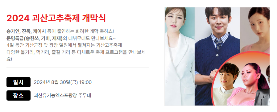 8월30일 열리는 괴산고추축제 개막식에서는 송가인,진욱,케이시 등 화려한 초대가수로 구성된 개막 축하쇼가 열립니다.