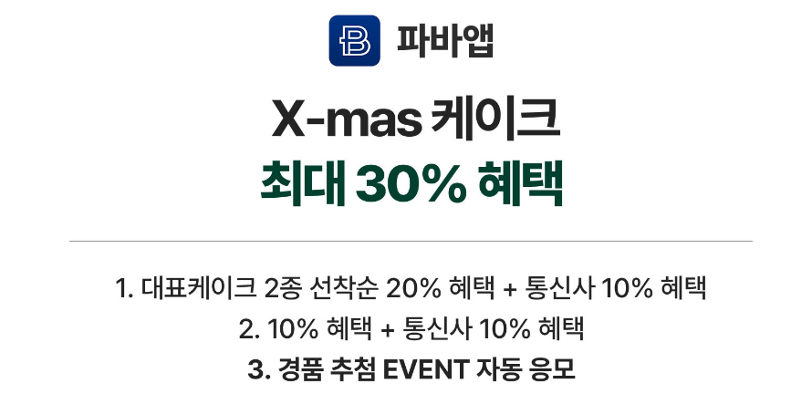 파리바게트 어플인 파바앱을 통해서 크리스마스 케이크 사전예약을 하시면 X-mas 케이크 최대 30% 혜택이 주어집니다.