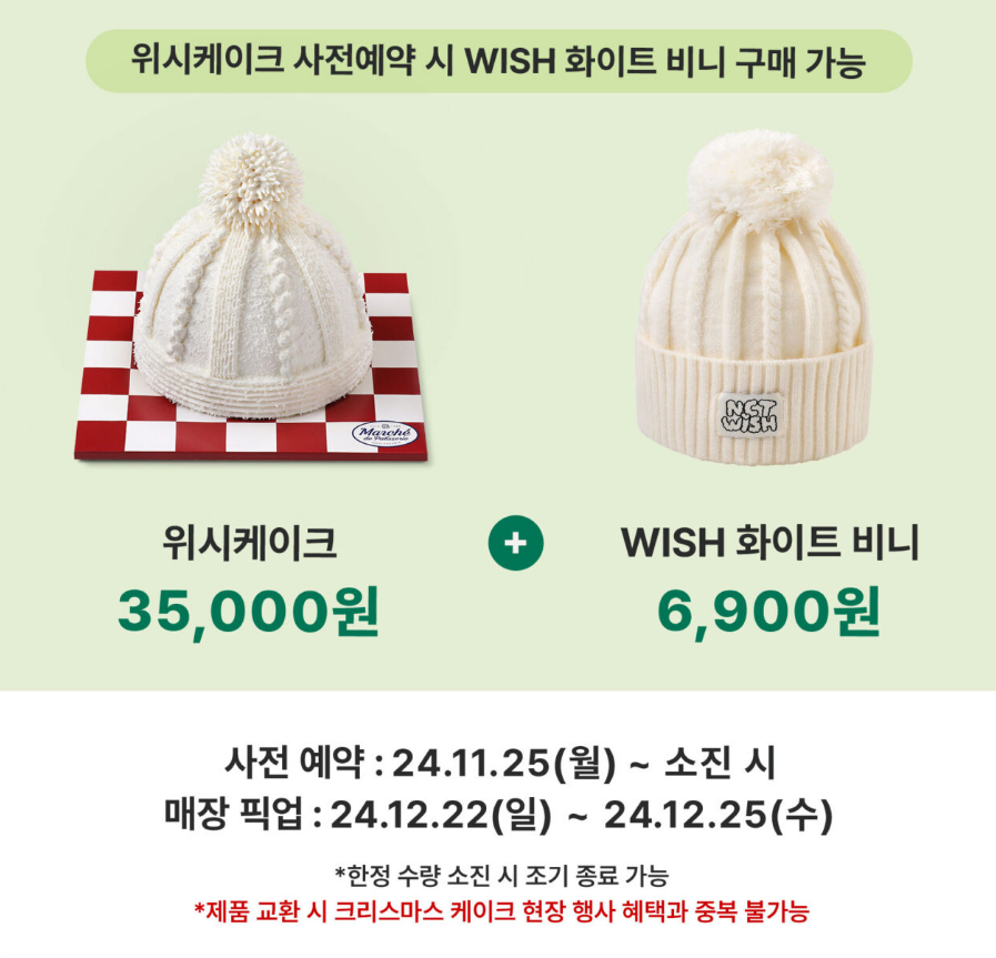 위시케이크 사전예약시 WISH 화이트 비니를 저렴한 가격에 구매하실 수도 있습니다.