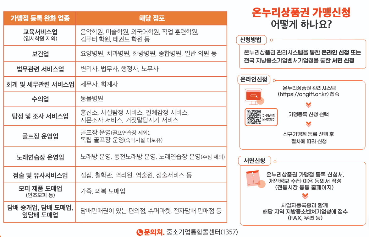 온누리 상품권을 사용하는 것도 우리 동네 소상공인들에게 도움이 됩니다. 대형마트나 백화점 대신 전통시장에서 쇼핑하는 것도 우리 지역 경제에 도움이 됩니다. 2024년 9월 10일부터 아이들 학원이나 병원 또는 일반 의원, 노래방 등에서도 가맹점 등록이 가능하도록 규제가 완화되었습니다. 소상공인에게 신규 가맹을 통해 경쟁력을 강화할 수 있는 좋은 기회이므로 해당되는 업종에서는 신청하시는게 좋겠습니다.
