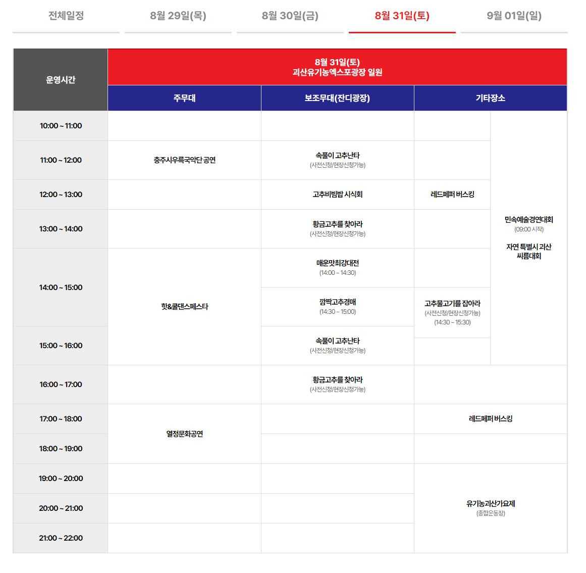 8월 31일 댄스경연대회로 핫한 축제 분위기를 느끼실 수 있으며, 맛있는 고추비빔밥 시식회, 씨름대회 및 민속예술 경연대회도 열릴 예정입니다. 우리가족고추요리대회와 더드림콘서트, 괴산불빛캠핑, 윷놀이 등 다채로운 행사 프로그램이 많이 준비되어 있으니 가족들과 즐거운 추억 만들 수 있는 시간이 되시기를 바랍니다.